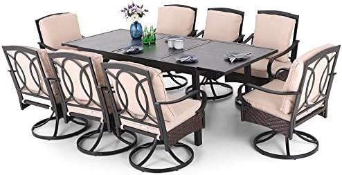 This outdoor dining set features a rectangle extendable table that can accommodate up to 8 people, making it ideal for family gatherings or entertaining friends. The table measures 62″ L x 37.5″ W x 30″ H when closed and extends to 84″ L, allowing for versatility based on your needs. The set includes 8 swivel chairs, designed with sturdy PE hand-woven rattan and metal frames, which offer durability and support for all-weather conditions. The 360-degree swivel feature enhances mobility and interaction, making it perfect for any social occasion. Another highlight is the special E-coating technology that protects the furniture from rust and wear, ensuring a long-lasting investment for your patio or backyard.