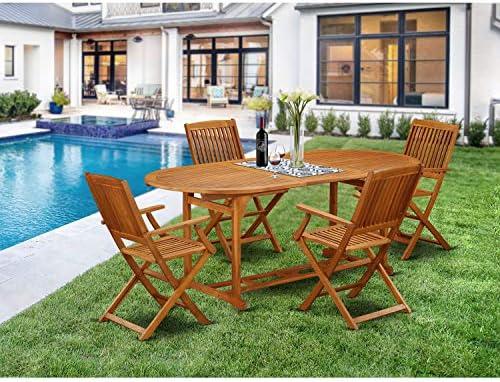 This charming outdoor dining set combines a modern oval table with four folding chairs, perfectly accommodating up to four people. Made from premium Acacia wood, it boasts durability and a beautiful natural oil finish that enhances water resistance. The oval-shaped table, paired with bistro-style chairs featuring slatted backs and comfortable armrests, makes it an inviting choice for any patio, balcony, or outdoor space. The folding function of the chairs allows for effortless storage, making it ideal for those with limited space.