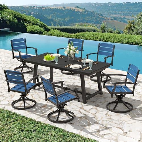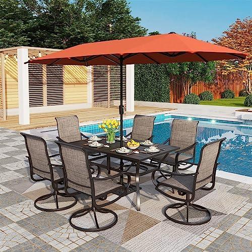 This outdoor dining setup combines functionality and style, featuring six swivel chairs that can rotate 360 degrees, allowing for easy movement and gentle rocking. Crafted with an E-coating steel frame, the chairs offer durability and support while maintaining a comfortable ergonomic design that supports relaxation with its padded back and seat made from breathable sling fabric. The large metal table, with an umbrella hole, provides ample space for dining and entertainment, making it a versatile addition to any patio, garden, or lawn.