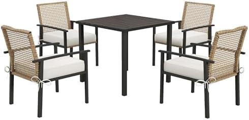 The furniture is meticulously crafted using hand-woven PE rattan, providing an elegant wicker look with superior weather resistance. The frames feature a powder-coated finish, ensuring durability and safety against water damage. However, potential buyers should be mindful that assembly is required and the set has specific weight limits — chairs can hold up to 264 lbs, while the table supports 154 lbs. this outdoor dining set offers great comfort and style, although the assembly process might require a bit of effort.