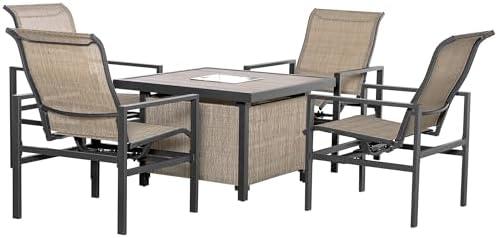 This five-piece outdoor dining ensemble combines functionality with a modern aesthetic to create the perfect setup for al fresco dining. The large square table features a built-in ice bucket at its center, allowing you to chill beverages or appetizers effortlessly while you entertain. Measuring 35.5 inches in length and width, this dining table pairs beautifully with four sturdy rocking chairs designed for comfort, complete with high curved backrests and dual armrests. The steel construction ensures durability, making it a reliable choice for various outdoor settings, whether you are hosting a backyard barbecue or enjoying a quiet evening on the patio.