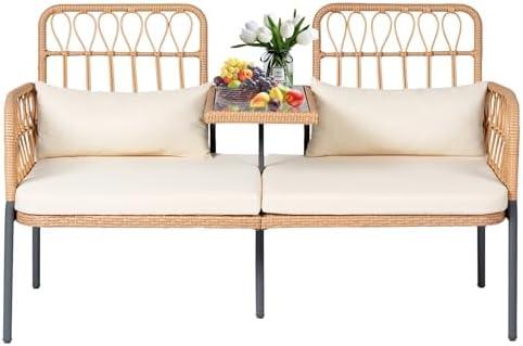 Stylish 2-Seat Outdoor Rattan Loveseat with Built-in Table