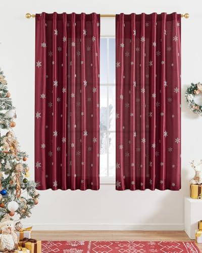 These charming curtains blend deep burgundy with intricate white snowflake embroidery, creating a spectacular winter aesthetic perfect for the holiday season. Made from silky fabric, they effortlessly filter natural light while maintaining privacy, ideal for any room in your home. The 63-inch length makes them suitable for both standard and tall windows, adding an elegant touch to your living room, bedroom, or office. Enjoy the versatility they provide with their dual hanging options, allowing you to either use a modern rod pocket style or an elegant back tab method for a tailored look.