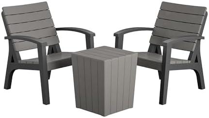 This outdoor chat set is designed for comfort and style, featuring two inviting chairs and a convenient side table. The weather-resistant resin is not only durable but also showcases a classic wood grain finish, perfectly enhancing the visual appeal of any outdoor area. With a weight capacity of 250 lbs per chair, it comfortably accommodates various guests. You can expect easy assembly that takes around 20 minutes, with all necessary tools included, making it an ideal choice for those who appreciate convenience. The contoured seats and backrests provide additional comfort, making it easy to relax during your outdoor gatherings.
