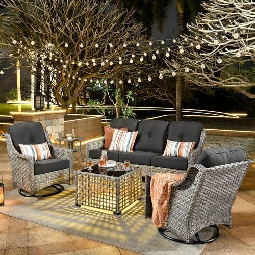 This outdoor furniture arrangement is designed with both aesthetics and comfort in mind. The incorporation of high-density rattan ensures durability against various weather conditions, while the 3.5-inch thick memory foam cushions provide an unparalleled level of comfort. The ergonomic rocking chair adds a unique element, allowing for a smooth 360-degree swivel action that enhances your relaxation experience. Furthermore, the glow-in-the-dark coffee table not only brings a modern touch but also creates a cozy ambiance during nighttime gatherings, making it a perfect addition to any porch, backyard, or poolside area.