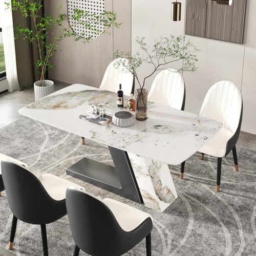 This dining table offers a perfect blend of style and functionality, featuring a sintered stone top that not only provides a luxurious aesthetic but is also highly durable. Measuring 63″ in width, it comfortably accommodates 6-8 people, making it ideal for family gatherings or dinner parties. The minimalist design and antique white finish add a touch of elegance to any dining space, whether it’s a home, studio, or apartment. Its impressive carbon steel base enhances stability and can support significant weight, ensuring that the table remains steady during use.