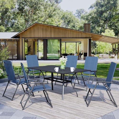 Our experience with this outdoor dining set has been quite enjoyable and practical. The 63″ x 38″ rectangle table provides ample space for meals with family and friends. Its sleek black surface, enhanced by eco-coating, not only looks stylish but is easy to clean, which we greatly appreciate after dining outdoors. The set includes six blue folding chairs that complement the table perfectly. Made from lightweight steel and featuring textilene mesh fabric, these chairs are both breathable and comfortable, allowing us to relax for longer during meals. Folding functionality makes storage straightforward, and we find it incredibly convenient for our backyard gatherings.