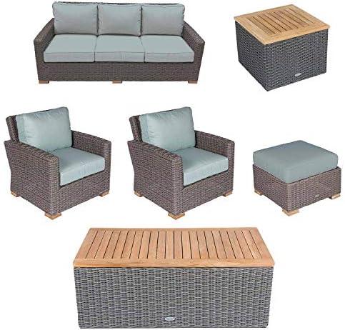 The versatile wicker patio conversation set is a great addition to any outdoor space, offering a mix of comfort and style. Crafted with all-natural teak and sturdy resin wicker, each piece is designed to withstand the elements while providing a plush seating experience. The set includes a spacious sofa, two comfortable chairs, an ottoman, and both a rectangular coffee table and a side table, all elegantly crafted to enhance your entertaining space. The cushions are not only deep and inviting but also made from heavy-duty outdoor fabric, ensuring they maintain their appearance and comfort through various weather conditions.