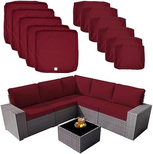 The 11-piece outdoor cushion cover set is designed to provide an excellent replacement for worn-out cushions, fitting perfectly on a 5-seater wicker rattan patio furniture set. Crafted from 300gsm yarn-dyed polyester fiber, these covers deliver a balance of durability and comfort. They feature heavy-duty zippers and anti-slip silicone particles at the bottom to keep cushions securely in place. The UV-resistant fabric ensures you can use them across seasons without worrying about fading or deterioration due to harsh sunlight. Besides the appealing burgundy color, the covers are splash-proof, allowing for easy maintenance when spills occur.