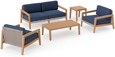 This outdoor furniture set is the perfect blend of style and comfort, featuring a beautiful teak wood frame paired with chic woven rope detailing. The loveseat and two chat chairs are equipped with extra thick cushions covered in easy-to-clean, fade-resistant fabric that promises both durability and relaxation. With its modern slatted design, the versatile coffee table and side table not only add functionality by keeping refreshments at hand but also elevate the overall aesthetic of your patio area. Ergonomically designed cushions with quick-dry foam ensure that the set remains comfortable and practical for outdoor use throughout the seasons.
