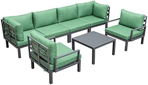 This modular patio seating arrangement is designed to offer a cozy outdoor experience, comfortably accommodating 6-7 adults with its well-padded cushions and versatile layout. The configuration options are abundant, enabling you to customize your space by transforming pieces into ottomans, armchairs, or corner seats at your convenience. Crafted from strong, durable powder-coated aluminum, this set is built to withstand outdoor elements, including rust and UV exposure. The addition of plastic floor caps enhances the overall aesthetic by concealing screws and protecting your patio surface from scratches.