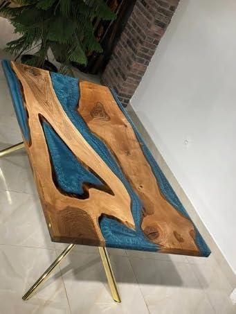 This beautifully handcrafted dining table combines a unique river look with a stunning solid Carolina blue epoxy resin finish. Measuring 108 x 36 inches and standing 30 inches tall, this piece has versatile applications as a conference table, patio table, kitchen table, console table, bar counter, or coffee table. Its customizable design allows you to select various wood patterns and resin colors to match your unique aesthetic preferences. The table is meticulously crafted by skilled artisans who ensure that every piece is a work of art deserving of its place in your home.