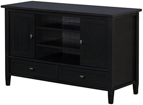 This versatile media stand is perfectly designed for TVs up to 52 inches, offering both style and practicality. With its sleek black finish and handcrafted solid wood construction, it enhances any entertainment area while providing a sturdy base for your television. The stand includes a spacious central area with adjustable shelves to accommodate gaming consoles and media devices, alongside two functional bottom drawers for extra storage. The shaker-style doors and antique brass knobs add a touch of elegance, making it a perfect fit for transitional decor.