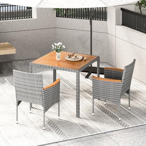 This outdoor‌ dining set showcases a perfect ⁤blend of style ​and practicality, serving ‍as an excellent centerpiece‍ for any garden ​or patio. Crafted from lightweight,⁤ low-maintenance round​ PE⁣ rattan, it offers durability⁤ and​ ease of ⁤cleaning with just a damp ‍cloth. The solid acacia wood tabletop adds a touch of ‌elegance ‌and is ideal for dining or displaying decorative items. ​Adjustable⁢ backrests, ⁣paired with⁢ thickly padded cushions, provide maximum⁣ comfort whether ‌you’re dining or lounging. The cushions are designed with removable, washable⁤ covers, ​ensuring ‍long-lasting freshness while the powder-coated steel frame ensures stability.