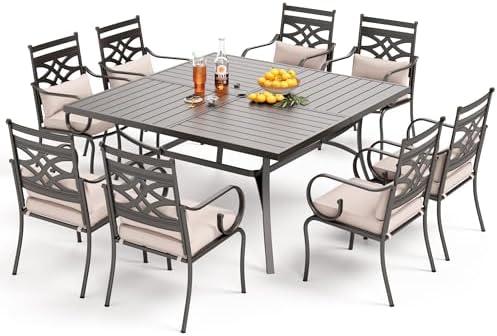 This outdoor dining arrangement features thick, ‌soft​ cushions designed ⁢for maximum comfort, with ‍ergonomic support that⁢ ensures a pleasant ‍sitting experience. The cushions are larger than average and include zippered covers, making them easy to clean. Additionally, an extra small pillow is included, ‌providing lumbar⁤ support for enhanced relaxation during meals, ‌gatherings,​ or casual ‍lounging. The outdoor dining set consists of​ a ‍generous​ steel square table accompanied by eight chairs, seamlessly accommodating family ​and ‌friends while enjoying the beauty of your garden or deck.
