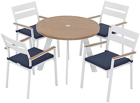 JOIVI​ 5 Piece Outdoor Dining Set, Aluminum Patio Furniture Dining Table and ⁣Stackable Chairs Set for ⁢4 People,‍ 2.05” Umbrella Hole with Wood Grain Tabletop, for Deck, Backyard, Navy Blue Cushions