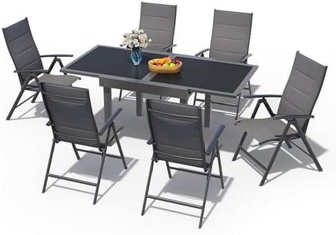 7-Piece⁢ Patio​ Dining Furniture Set with Adjustable Folding Chairs 1 ‍Expandable Table⁢ Grey⁢ Modern Contemporary​ Rectangular Glass