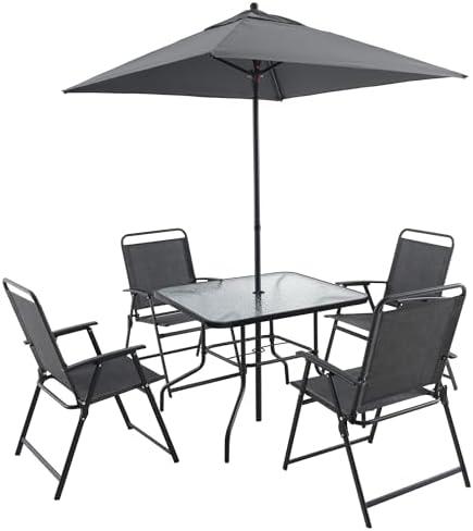 This stylish dining set is designed to enhance your outdoor experience⁣ with its functional elements‌ and modern aesthetics. ​Featuring a square tempered ‍glass ‍tabletop, four comfortable folding⁤ chairs, and a ‌sturdy fabric umbrella, it creates a perfect environment for small⁤ gatherings, ​family dinners,‌ or leisurely afternoons. The all-weather rust-resistant, powder-coated steel⁢ frame ​ensures durability, enabling you to​ enjoy ⁤outdoor ⁣meals throughout the⁣ year. Its compact design permits ‌easy storage, making it a⁣ great choice ‍for those with limited⁤ space.