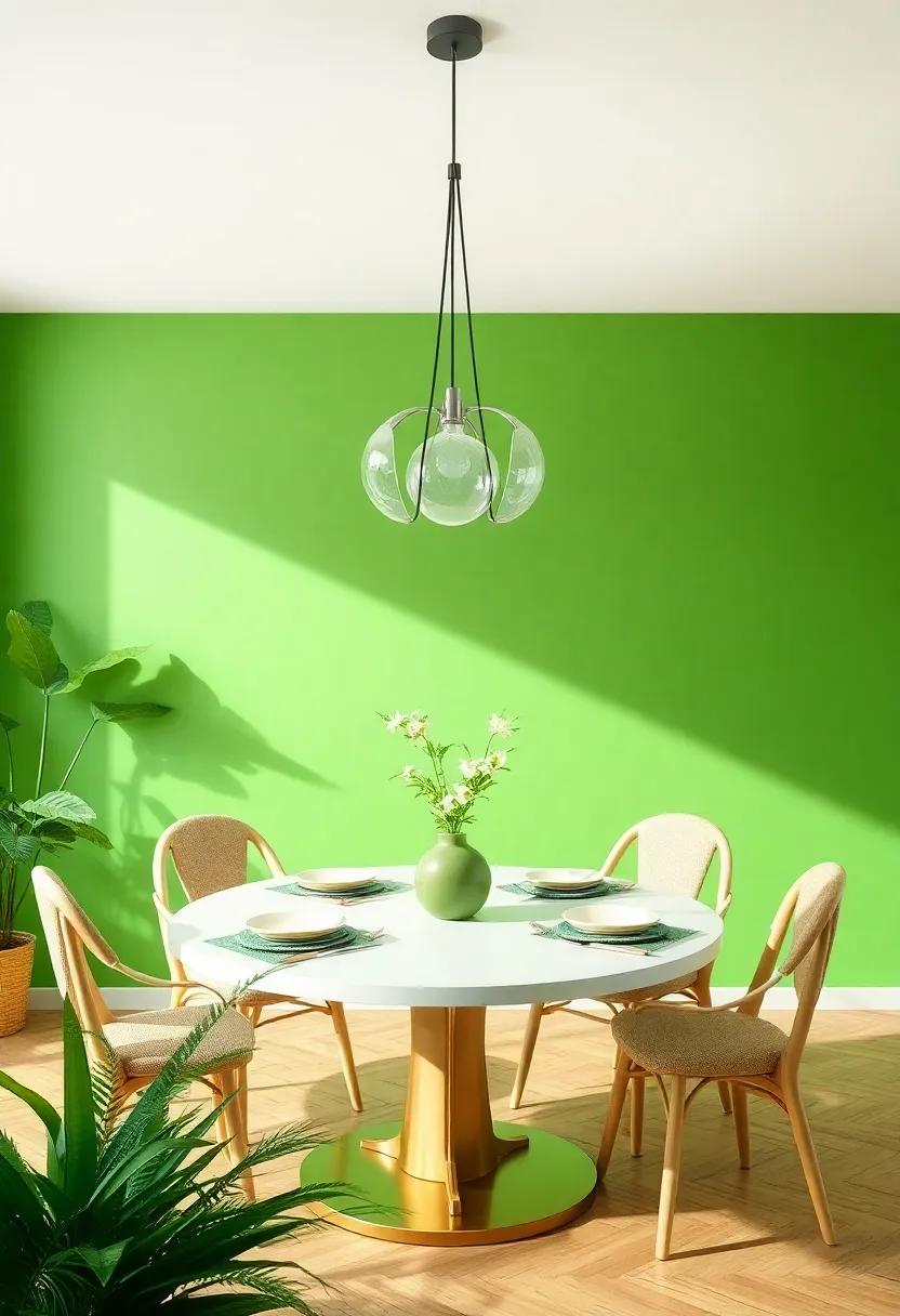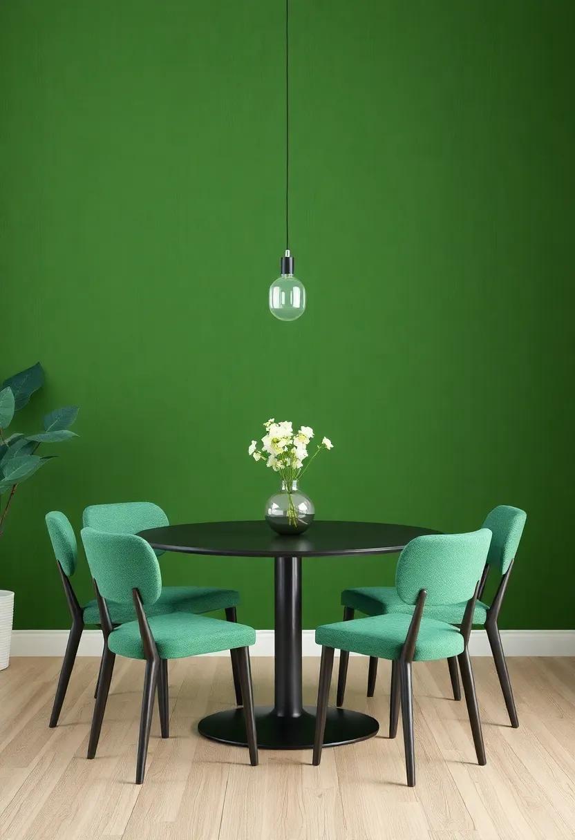 Transforming a blank wall into a statement green wall or mural can dramatically elevate the ambiance of your dining room. This design element serves not just as a backdrop for your dining experience, but as a captivating focal point that draws the eye and invites conversation. Consider using lush, vibrant plants or large-scale mural artwork that showcases nature-inspired themes, such as: