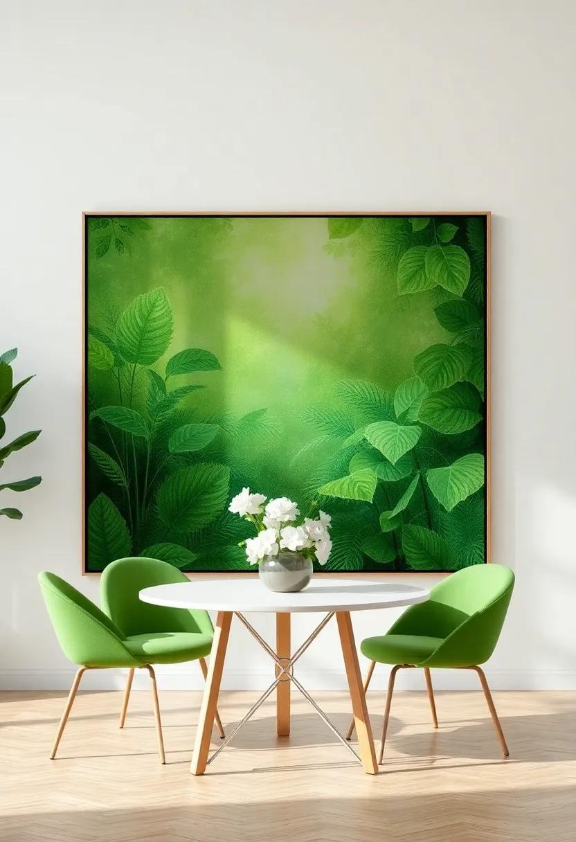 Transform your dining room into a vibrant oasis by embracing art pieces that reflect the natural world. Consider creating a nature-inspired gallery wall featuring framed botanical prints, leaf imprints, or even pressed flowers. These artworks add texture and interest while echoing the verdant color schemes of your decor. You might also opt for a large canvas print of a serene landscape or forest scene, which can serve as a stunning focal point, inspiring conversation while echoing the soothing vibes of lush greenery.