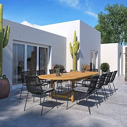 This exquisite dining set combines contemporary design with exceptional durability, making it a perfect addition to any patio or indoor space. Crafted from 100% FSC certified teak, the rectangular extendable table spans 118 inches in length when fully extended and is complemented by ten lightweight steel chairs, designed with modern lines and a comfortable rope seat. The ensemble not only boasts an elegant aesthetic but is also built to withstand various weather conditions, allowing you to enjoy al fresco dining throughout the year. Additionally, the free maintenance kit enhances longevity, featuring essential tools like wood cleaner and sealer oil to help maintain its golden-reddish finish.