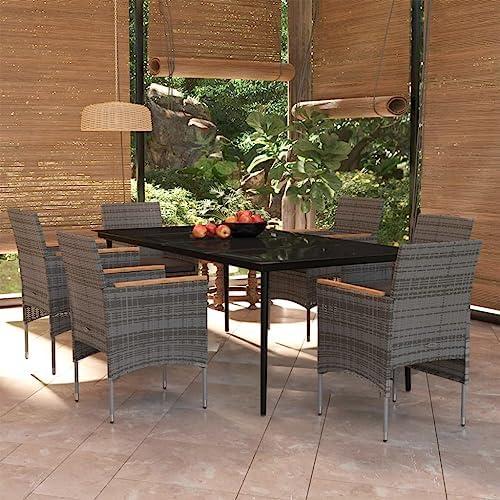 This elegant outdoor furniture collection combines design and functionality, making it an excellent addition to any outdoor space, particularly in smaller settings. Made with a sturdy powder-coated steel frame, the table and chairs promise durability for everyday use. The water-resistant PE rattan ensures easy maintenance, while the smooth glass tabletop provides a contemporary look that is also user-friendly for dining or entertaining. With six chairs and comfortable cushions, this set creates a welcoming atmosphere for family meals or casual gatherings.