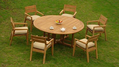 7 PC A Grade Outdoor Patio Teak Dining Set – 72″ Round Table & 6 Vellore Stacking Arm Chairs