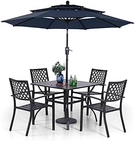 Transform your outdoor space with this attractive dining set that includes four stackable chairs, a sturdy square table, and a generous umbrella designed to provide ample shade. The metal frame ensures durability, featuring an e-coating that resists rust and weather damage, eliminating the need for special maintenance. The umbrella’s three-tier design not only enhances ventilation but also blocks sunlight effectively from various angles. Assembly is straightforward, requiring just a wrench and minimal effort, making it a user-friendly choice for any setting, whether it’s a patio, deck, garden, or poolside.