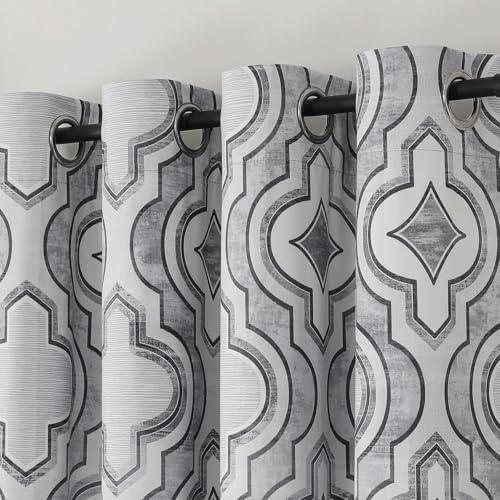 These blackout curtains embody a perfect blend of style and function, featuring a stunning geometric design that adds a touch of elegance to any room. Made with a triple weave fabric construction, they block out 75% to 80% of light and UV rays, making them ideal for bedrooms, nurseries, or any space where privacy and light control are desired. Their modern aesthetic, showcasing a contemporary mix of light and dark gray tones on a white background, complements a variety of décor styles. With eight silver grommets, these panels not only offer an easy installation but also enhance the overall visual appeal.