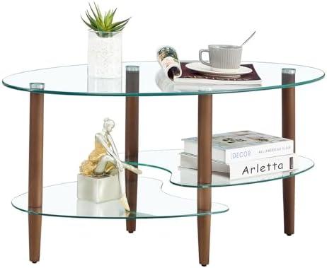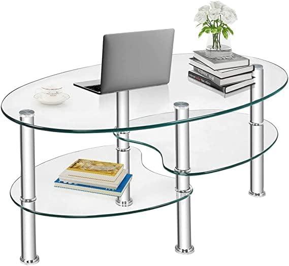 Modern oval coffee table with 3-tier design & spacious glass surfaces