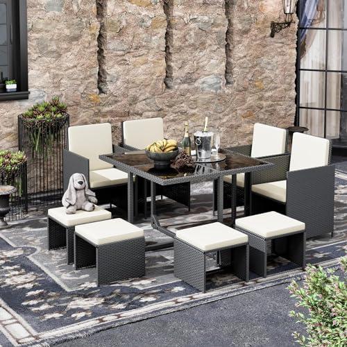 This outdoor dining set offers a perfect blend of style and practicality, making it an excellent addition to any patio, garden, or poolside area. The steel frame and hand-woven PE rattan construction ensure durability and weather resistance, while the soft sponge cushions provide comfort during meals or conversations. The set includes 4 wicker chairs, 4 ottomans, and a glass dining table, accommodating gatherings of family and friends. With a weight capacity of up to 300 lbs, it is suitable for various occasions, from casual lunches to festive parties. The chairs can be conveniently stored under the table, and the ottomans can be tucked away under the chairs, promoting a clean and organized outdoor space.