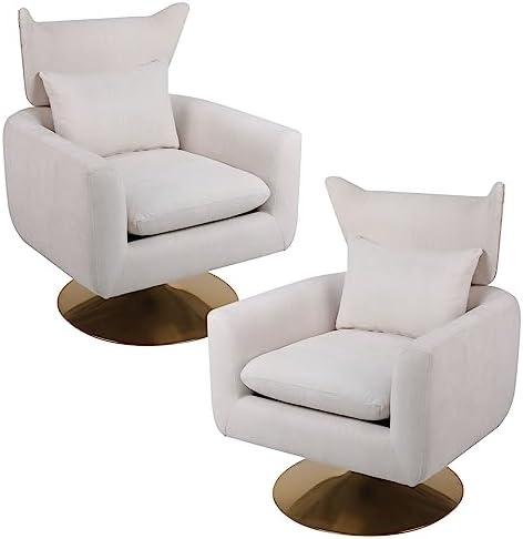 These accent chairs are designed with a modern mid-century aesthetic, featuring a luxurious beige linen upholstery and a sleek gold base. With a generous size of 29.9″W x 29.9″D x 36.6″H and a weight capacity of 300 lbs, they provide ample comfort and support for various occasions. The 360-degree swivel function enhances their utility, making them ideal for activities like reading or entertaining guests. Easy to assemble, these chairs can be put together in just about ten minutes, bringing style and functionality to any living space, whether it’s your living room, bedroom, or office.