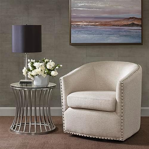This stylish swivel chair boasts a beautifully upholstered design that includes eye-catching nailhead detailing. The barrel-style back not only contributes to a classy appearance but also provides excellent support. Measuring 28 inches wide and featuring a high-density foam cushion, it promises a deep and comfortable seating experience that is perfect for a variety of uses—from reading to enjoying a movie. The chair’s durable construction allows for a maximum weight capacity of 300 lbs, making it suitable for many different users.
