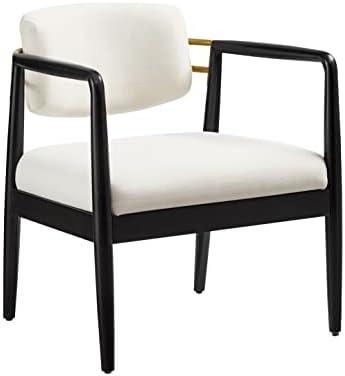 When considering this chair, you’ll find several advantages. It features a soft ivory fabric paired with a sleek black solid wood structure, accentuated by gold iron embellishments that elevate its sophistication. However, potential downsides include a weight capacity of 250 lbs, which might limit use for some individuals. Additionally, the chair’s assembly, while straightforward with included tools, might require some time and effort. this versatile seating option suits various decor themes beautifully.