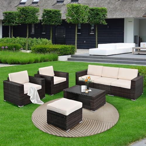 This stylish outdoor furniture arrangement offers an extraordinary comfort experience with its soft cushions and ergonomic design. With ample seating for up to six people, it comprises two corner sofas, two single sofas, one armless single sofa, one ottoman, and a glass-topped coffee table. The upgraded ultra-wide armrests, measuring 5.11 inches, provide superior support for your neck and arms, making it a perfect choice for relaxing afternoons spent in your backyard or garden. Its versatile design also allows for various combinations, adapting seamlessly to any outdoor space without compromising aesthetics.