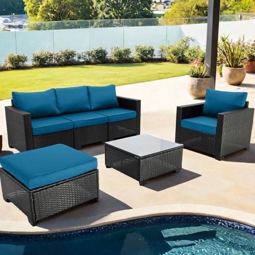 This six-piece patio sectional furniture set combines high-quality materials with a modern aesthetic, perfect for enhancing outdoor spaces like your backyard, garden, or poolside. The sectional includes four wicker sofas, matching ottomans, and a tempered glass-topped table, all designed to create an inviting lounging area. The multi-color rattan and vibrant cushion covers not only elevate the set’s visual appeal but also seamlessly blend into various outdoor environments, making your patio the focal point for gatherings and relaxation.