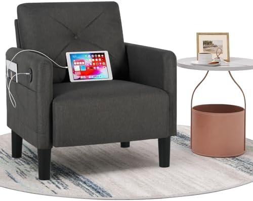 This chic accent chair combines modern aesthetics with practical features, making it an ideal addition to any small living space. Crafted from high-quality linen fabric, it boasts a sleek, minimalist design that fits seamlessly into various decors, from contemporary to mid-century modern. The ergonomic shape ensures comfort with a thick backrest and cushioned armrests, perfect for relaxing while reading or watching TV. Plus, the dual side pockets provide handy storage for books or gadgets, while the built-in USB charging ports become indispensable for those who enjoy their electronic devices close by.