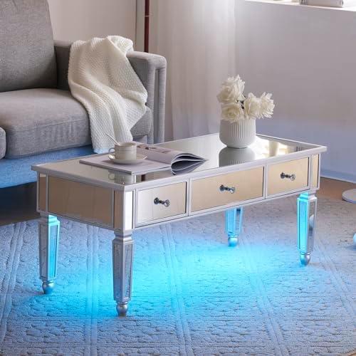 Modern Mirrored Coffee Table with LED Lights and Storage