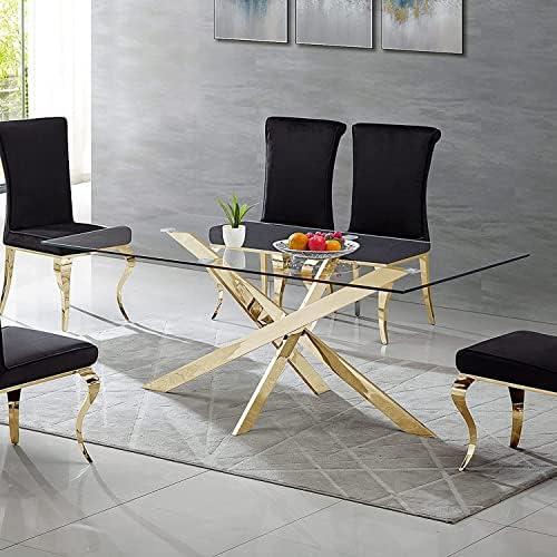 This contemporary dining table features a sleek 0.39″ thick tempered glass top supported by robust mirrored stainless steel legs in a unique criss-cross design. With dimensions of 63″L x 31.5″W x 29.92″H, it provides ample space for 4 to 6 diners, making it an excellent choice for family meals or entertaining guests. The surface is scratch-resistant, ensuring its appearance remains pristine even with regular use, while its versatile design seamlessly fits into various spaces, from dining rooms to offices.