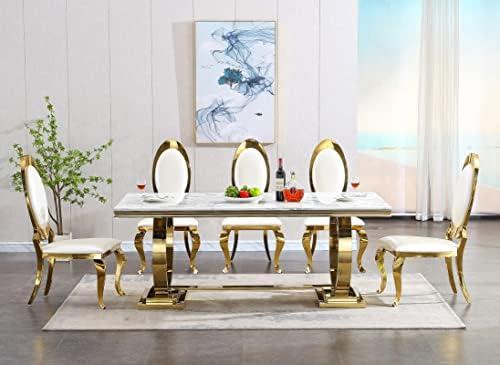 The table’s contemporary design is accentuated by its double U-shape stainless steel base with a gold mirror finish, which not only adds stability but also enhances the luxury feel of the piece. Pros include its durable construction, timeless design, and easy-to-clean surface, all of which make it a practical choice for modern homes. However, potential cons may include the heavy weight of the marble, which can make it difficult to move, as well as the need for careful maintenance to avoid scratches and stains on the surface. If you’re seeking a stylish yet practical dining solution, this table could be the perfect fit.