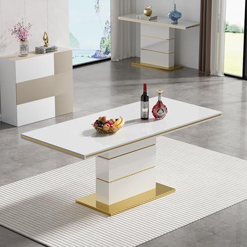 This modern dining piece features a high gloss MDF tabletop that measures 63 inches long, offering ample space to comfortably seat up to six individuals. Its luxurious gold mirrored stainless steel base adds a striking visual appeal, elevating the aesthetic of any dining or kitchen area. Crafted for durability, the tabletop not only looks stunning but is built to withstand daily use, ensuring that this table is both functional and a beautiful centerpiece. The eclectic design makes it a versatile choice for different settings including dining rooms, kitchens, and even offices.