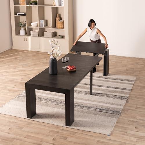 This modern dining table is exceptionally versatile, allowing you to easily transition from an intimate setting for two to a large gathering for up to twelve guests. Crafted from solid wood and engineered hardwood, it boasts durability and resistance to scratches and heat damage, ensuring longevity even in busy kitchen environments. Its sleek black finish strikes a perfect balance between mid-century modern and minimalist aesthetics, fitting seamlessly into any decor.