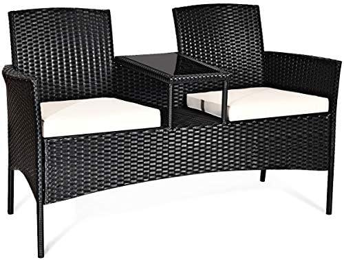 This elegant patio furniture set is designed to enhance the aesthetic of any outdoor space while providing exceptional comfort. Crafted with a rugged steel frame and high-quality weather-resistant rattan, it promises durability and long-term use. The spacious loveseat features a sloped backrest, wide armrests, and thick, soft cushions that conform to the body’s shape, making it an ideal choice for enjoying leisurely moments with a friend. A built-in tempered glass table offers convenient space for drinks or books, making it also practical for smaller areas like balconies or patios.