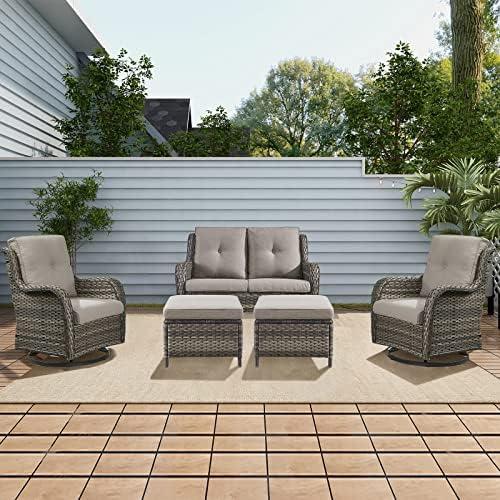 Elevate your outdoor space with a chic furniture set that prominently features two swivel rocking chairs, two versatile ottomans, and one loveseat. This collection is crafted from durable PE rattan wicker, showcasing a modern mixed grey finish that complements various patio aesthetics. Constructed with a sturdy steel frame, each piece is designed to accommodate up to 350 lbs per seat, making it suitable for gatherings or quiet evenings. The high back and wide armrests offer exceptional comfort, ensuring you and your guests can enjoy hours of relaxation. The 360-degree swivel functionality adds a fun twist to your lounging experience, while the option to store the ottomans under the coffee table optimizes space.