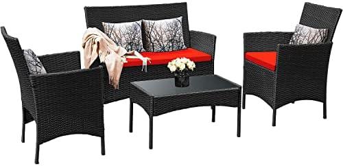This four-piece patio furniture set strikes a balance between style and practical functionality, making it an excellent choice for various outdoor settings such as a poolside, garden, or balcony. The set includes two stylish rattan chairs, a comfortable bench, and a sleek tempered glass table, all designed with an attractive black and red color scheme. The lightweight pieces are easy to assemble, and the included hardware and tools streamline the setup process. With dimensions that cleverly cater to smaller spaces, this furniture set can create a charming conversational area without occupying too much room.