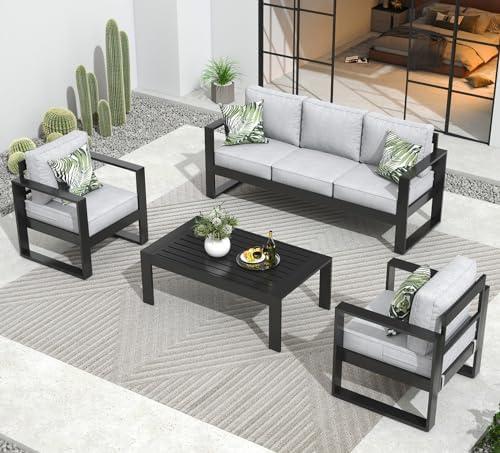 There are several advantages to this outdoor furniture set. Pros include its sturdy aluminum frame, easy assembly process, and comfortable cushion filling that provides both support and comfort. However, potential cons may involve the initial effort required for assembly, and while the cushions are designed to be weather-resistant, they should ideally be stored indoors during inclement weather to prolong their lifespan. this set is a great investment for those looking to enhance their patio with a blend of chic design and functional comfort.