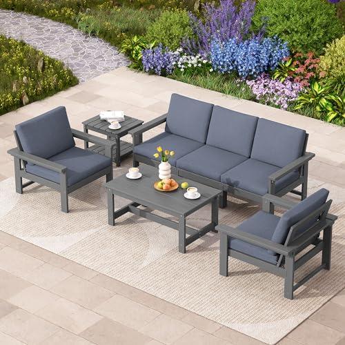 This versatile outdoor furniture set excels in providing both comfort and durability, thanks to its construction from high-density polyethylene (HDPE) material, which can withstand a weight capacity of up to 360 lbs per seat. The extra-thick cushions, measuring 3.5 inches, paired with a plush 7-inch backrest pillow, ensure that you and your guests enjoy long hours of relaxation and conversation without discomfort. The generous dimensions of the seating—31.5”L x 32.1”W x 30.3”H—allow for plenty of room, freeing you to stretch out and enjoy your outdoor space. Additionally, the set is designed for easy cleaning with its smooth woodgrain embossed surface, making it an attractive yet practical choice for any patio or lawn.