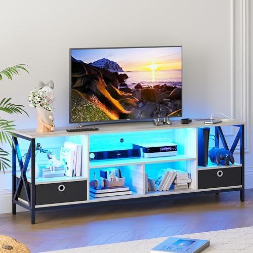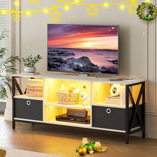 This entertainment center is designed to support television sizes ranging from 55 to 65 inches, making it an ideal focal point for your living room or bedroom. It features two fabric drawers that provide convenient, enclosed storage, perfect for keeping your media accessories organized and out of sight. The open shelves on either side not only enhance the modern aesthetic but also perfectly accommodate speakers and gaming consoles, catering to all your entertainment setup needs. The addition of customizable LED light strips adds a dynamic touch, allowing you to transform the ambiance to match your mood, whether it’s a cozy movie night or an exciting gaming session.