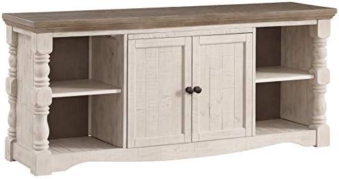 This TV stand seamlessly epitomizes modern farmhouse aesthetics, adorned with a striking distressed two-tone finish combining weathered gray and vintage white. It features turned posts that add robustness to its appearance while providing ample open shelving to maintain a light and airy feel in your living space. Crafted from a mix of durable materials—pine wood, pine veneers, and engineered wood—this unit combines charm with functionality, making it an ideal centerpiece in homes that embrace both comfort and style. Plus, the thoughtfully designed compartments, complete with cutouts for wire management, ensure an organized look while accommodating TVs up to 65 inches.