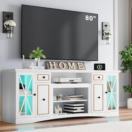 This modern entertainment center boasts a sleek farmhouse design, combining aesthetics with functionality. The spacious tabletop can comfortably hold TVs up to 75 inches, making it a great centerpiece for your living room. With four door cabinets, two open compartments, and two drawers, this unit offers considerable storage space. Its height-adjustable dividers allow customization to accommodate various items, from decorative pieces to multimedia devices. The chic touch of integrated LED lighting inside the glass cabinet doors adds a stylish flair that enhances your décor.
